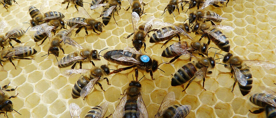 Hier sehen Sie eine Blau Markierte Bienenkönigin ! Die Markierung zeigt Die Jahreszahl an wann die Königin geschlüpft ist !